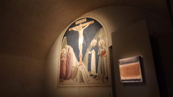 Intendiamoci: un quadro di Rothko non è un contraltare politico diretto di Trump e soci mentre lo è, e il termine non suoni blasfemo, in senso spirituale, profondo, meditativo, in senso religioso inteso come espressione del sacro al di là di qualsiasi religione e potere costituito. Quel senso del sacro, aperto a qualsiasi fede, a cui rimandano poeticamente i piccoli e intensi quadri astratti a San Marco accanto al Beato Angelico.