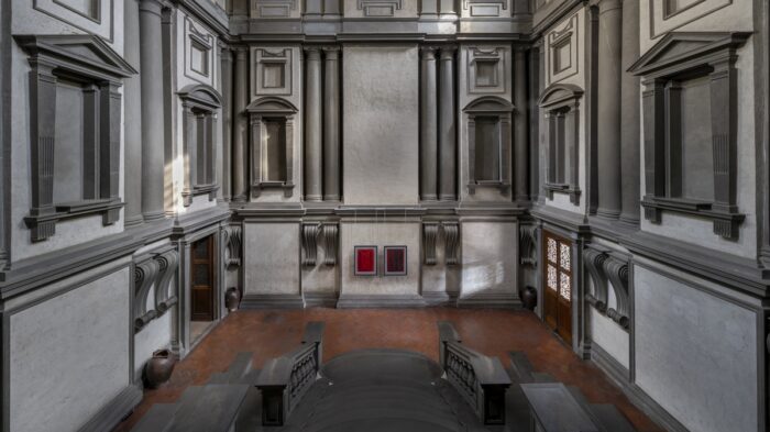 Quel richiamo alle porte e finestre murate ha un rimando preciso: il vestibolo progettato da Michelangelo nella Biblioteca medicea laurenziana con finestre cieche che l’artista newyorkese vide a Firenze nel 1950 rimanendo profondamente suggestionato. Il Buonarroti ora ritrova il suo ammiratore: il vestibolo monumentale espone due dipinti di Rothko come tappa esterna della retrospettiva sul maestro dell’espressionismo astratto aperta da sabato 14 marzo al 23 agosto e organizzata da Palazzo Strozzi.