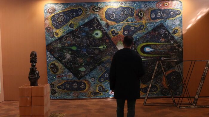 Un visitatore guarda “Oltre i cieli”, 2025, di Ako Atikossie, Courtesy Nashira Gallery. Tra le “Giovani voci” alla mostra a Palazzo Gotico a Piacenza “Sguardi sull’Africa” . Foto Stefano Miliani