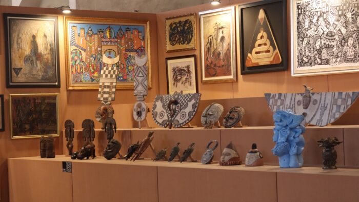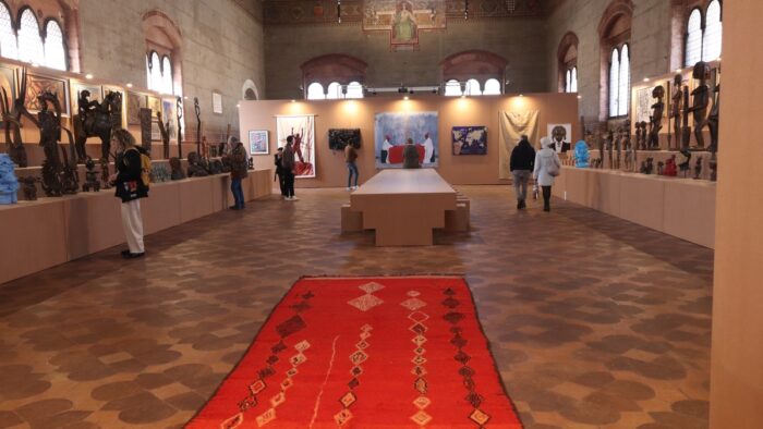 Qui, in tutta franchezza, si pone un problema. Non sta nelle opere: è nell’allestimento. Nella navata centrale “Sguardi sull’Africa” dispone su tribune a scalare sculture e manufatti e, dietro, la pittura marocchina. A parere di chi scrive l’effetto, involontario e pur nelle buone intenzioni, è che rende difficile vedere davvero le singole opere, le penalizza tutte invece di valorizzarle come i curatori vorrebbero, lo sguardo di un visitatore medio si confonde. Dispiace.