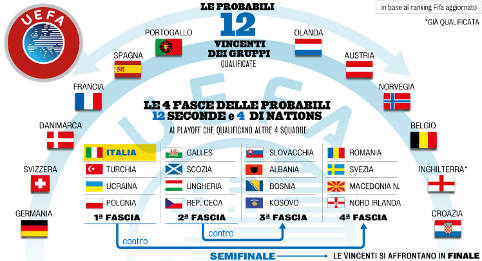 Di certo l’Italia sarà la prima della fascia 1 (10° nel ranking Fifa) e si assicurerà così di giocare in casa la prima delle due gare (sarà sorteggiato invece il luogo della finale) con un’avversaria della fascia 4, ovvero con una delle squadre della Nation League che ad oggi, ma solo ad oggi, potrebbero essere Romania, Svezia, Irlanda del Nord e Macedonia del Nord. Il prossimo 18 novembre tutto sarà chiaro e il 21 si conosceranno gli accoppiamenti, poi saranno solo campionato e Coppe, perché la prima gara, la semifinale, ci sarà solo il 26 marzo 2026.